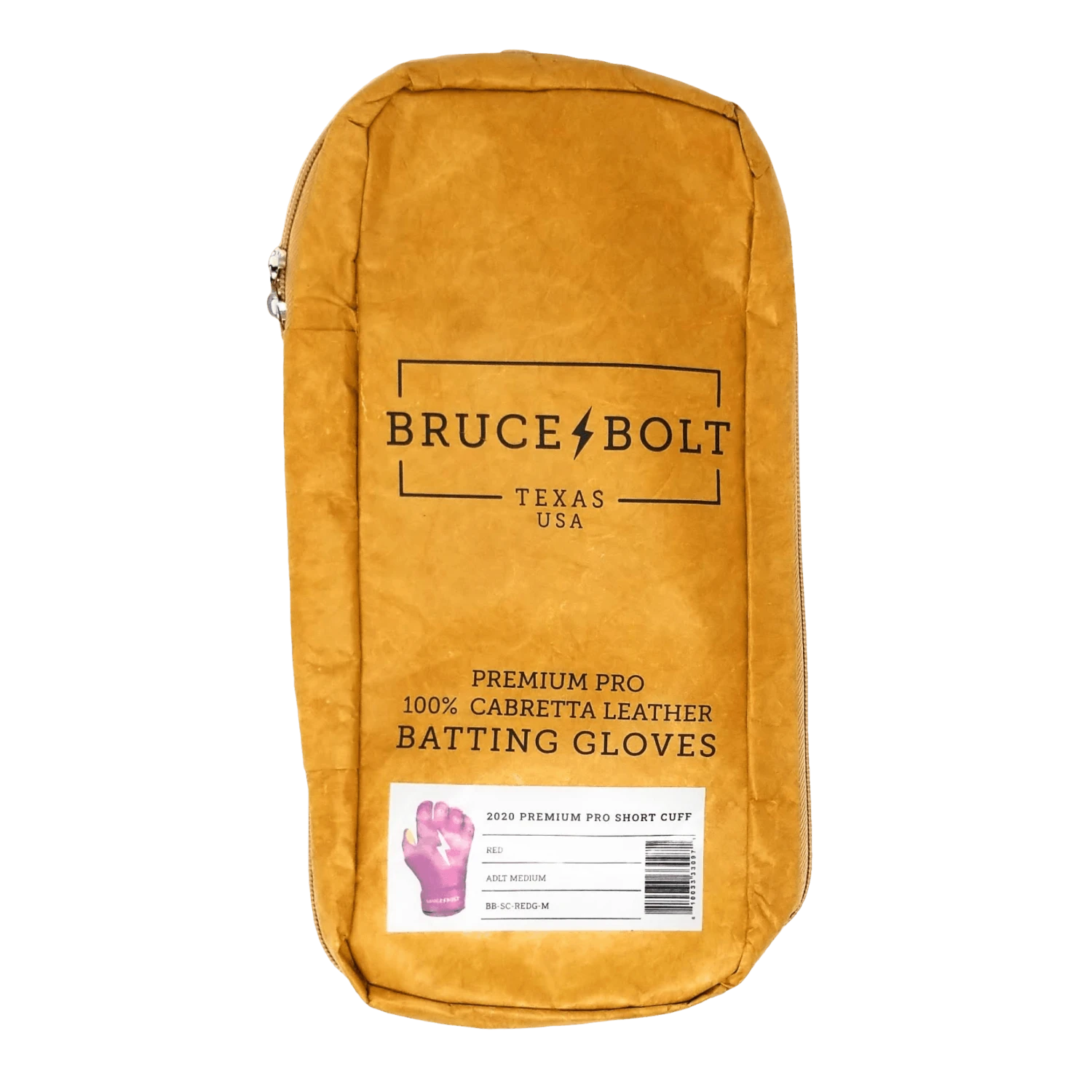 Each pair of BRUCE BOLT Red batting gloves are handmade by skilled craftsmen using only the highest quality 0.9mm Cabretta leather and stitching techniques which makes Bruce Bolt gloves buttery soft but more durable than any other glove on the market.