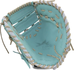 M Type fit system provides integrated thumb and pinky sleeves with enhanced thumb stall cushioning to maximize comfort and feel. The Marucci Palmetto Fastpitch First Base Mitt offers a deep pocket and tapered hand stall which provides a better fit and fielding control. The Fastpitch Palmetto First Base Mitt is built for the female catcher looking for a beautiful mint blue colorway.